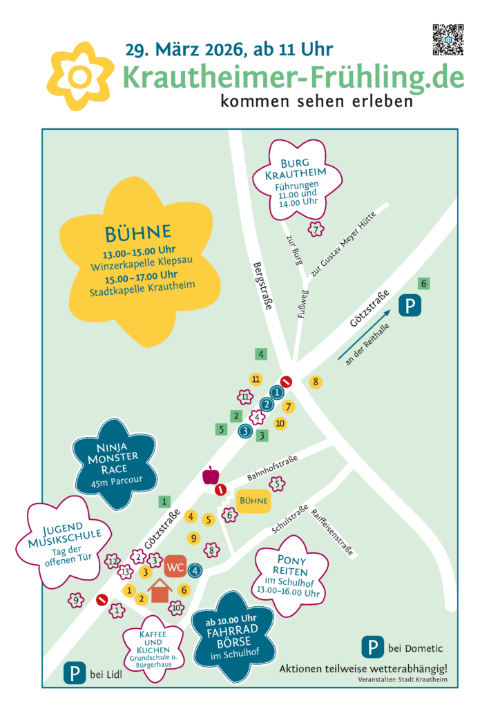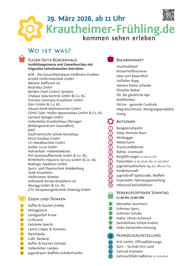 Der Gewerbeverein Krautheim heißt Sie herzlich Willkommen zum Frühlingsmarkt 2026 mit Ausbildungsmesse und Gewerbeschau namhafter Unternehmen aus dem Stadt- und Gemeindegebiet Krautheim.